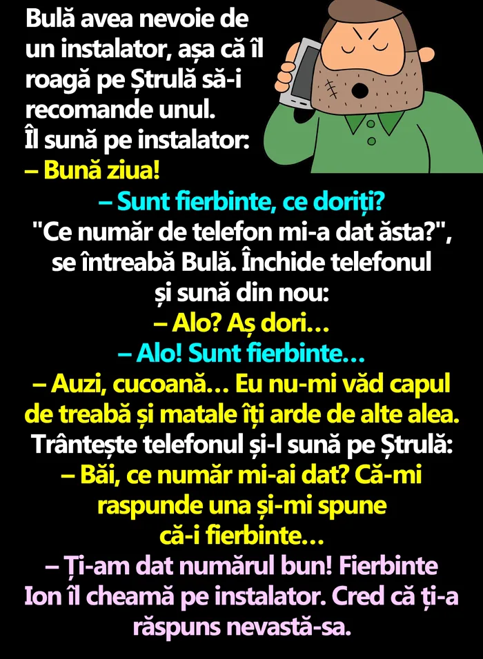 – Ți-am dat numărul bun! Fierbinte Ion îl cheamă pe instalator. Cred că ți-a răspuns nevastă-sa”…