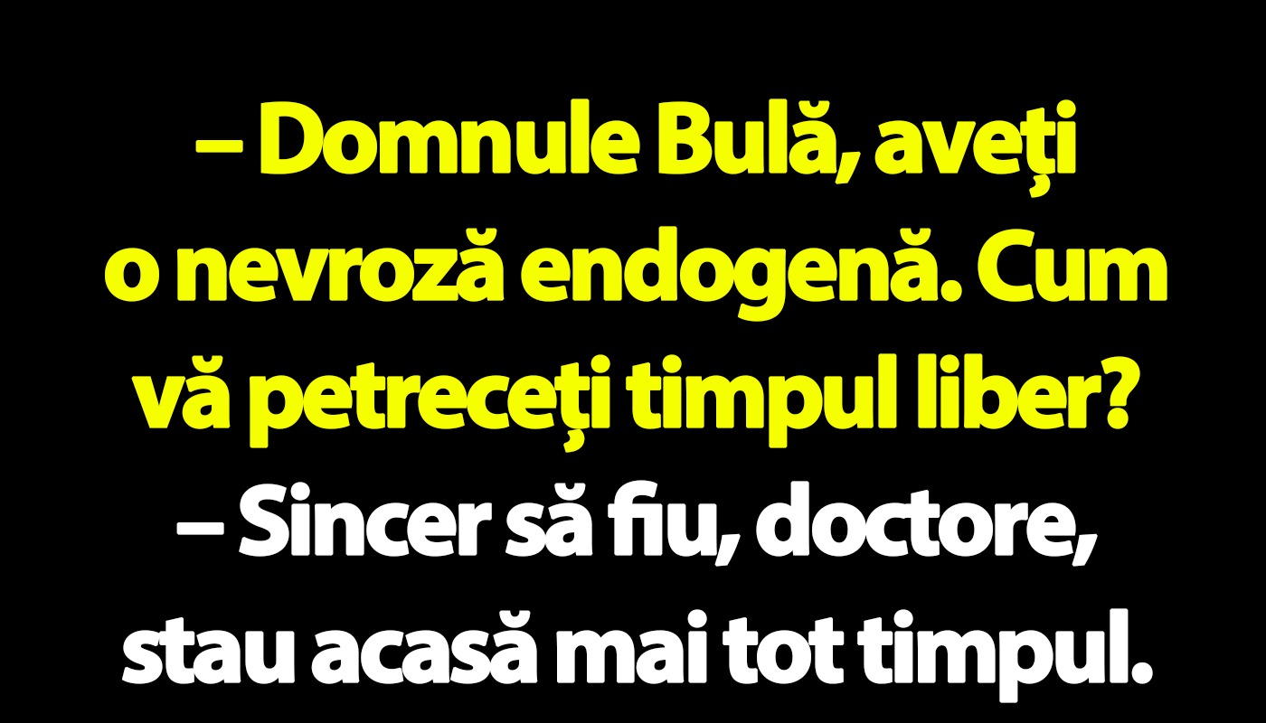 – Domnule Bulă, aveți o nevroză endogenă. Cum vă petreceți timpul liber?