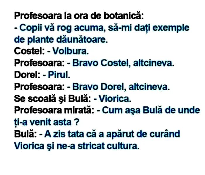 Dacă e vineri, atunci vă delectăm cu un nou banc marca „Bulă”. De data aceasta, Bulă este la școală, la ora de botanică. Lucrurile capătă un deznodământ hilar, după ce profesoara îi roagă pe copii să dea exemple de „plante dăunătoare”. Iată bancul!