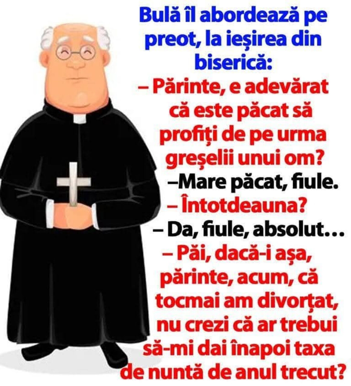 -Păi, dacă-i așa, părinte, acum, că tocmai am divorțat, nu crezi că ar trebui să-mi dai înapoi taxa de nuntă de anul trecut?