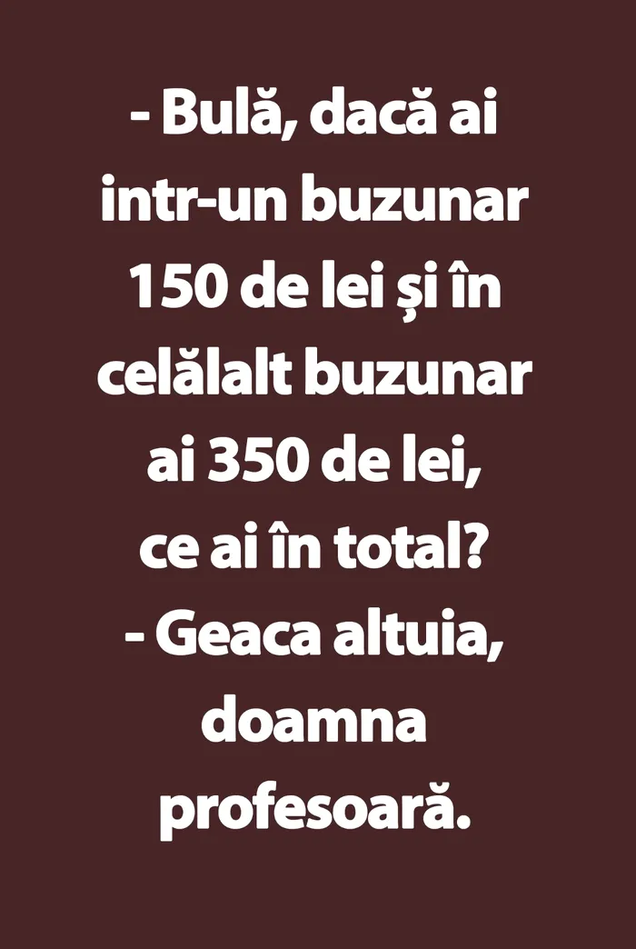 – Bulă, dacă ai într-un buzunar 150 de lei și în celălalt buzunar ai 350 de lei, ce ai în total?