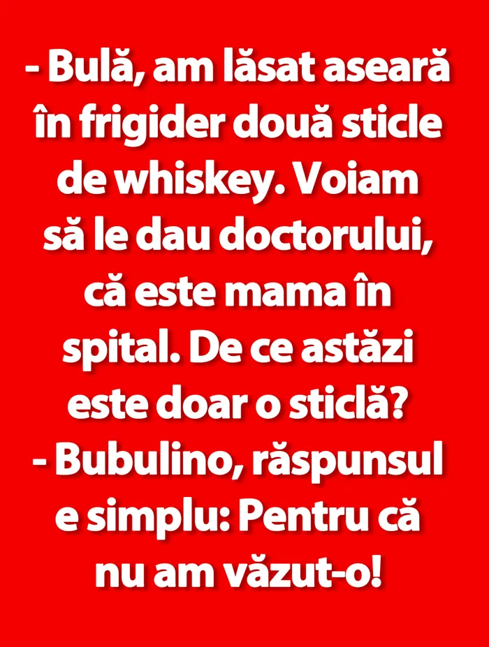 – Bulă, am lăsat aseară în frigider două sticle de whiskey. Voiam să le dau doctorului, că este mama în spital. De ce astăzi este doar o sticlă?