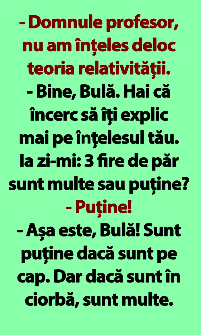 Bulă vrea să înțeleagă de la profesorul său care-i treaba cu teoria relativității. Profesorul îi dă o explicație… pe înțelesul lui. Iată bancul, mai jos!