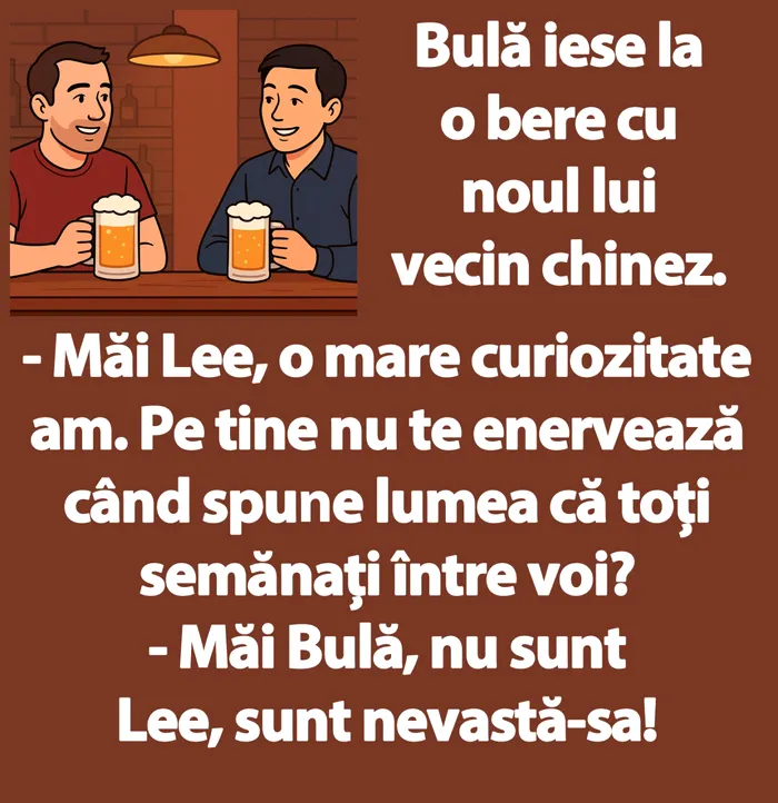 În această zi de sâmbătă, Gândul.ro vă pune zâmbetul pe buze cu un nou banc savuros. De data aceasta, personajul principal al bancului este celebrul Bulă. Acesta iese la o bere cu vecinul lui chinez.