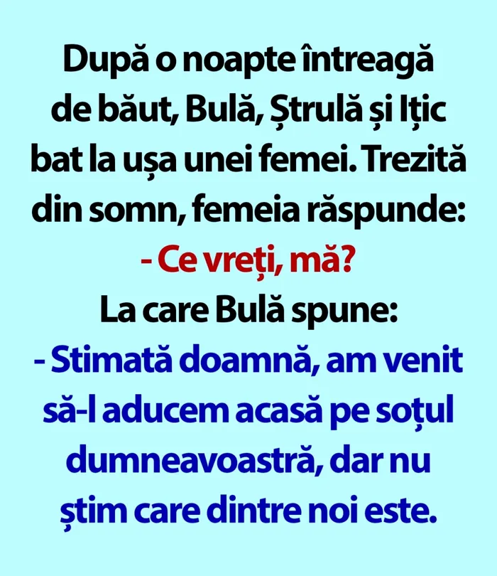 Sâmbătă, Gândul vă propune un nou banc spumos cu trio-ul Bulă, Ștrulă și Ițic. Ei au băut toată noaptea la birt, după care au bătut la ușa unei femei. Discuția este una apoteotică. Iată bancul!