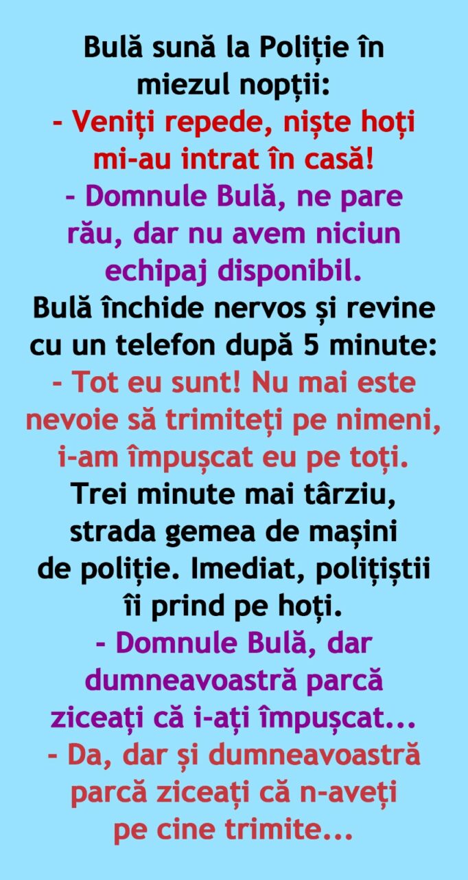 – Domnule Bulă, dar dumneavoastră parcă ziceați că i-ați împușcat…