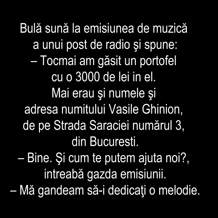 – Tocmai am găsit un portofel cu o 3000 de lei in el. Mai erau şi numele şi adresa numitului Vasile Ghinion, de pe Strada Saraciei numărul 3, din Bucuresti.