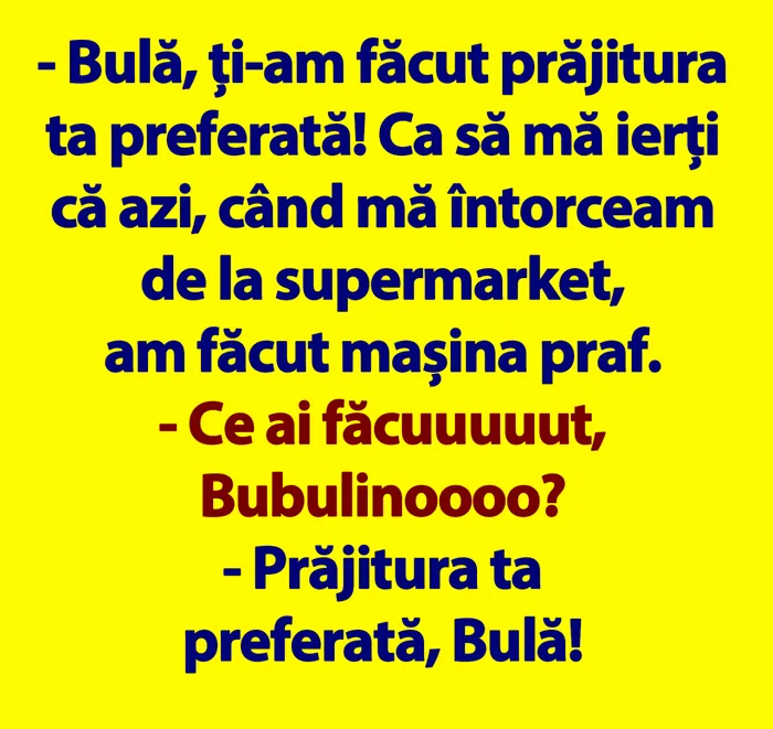 – Bulă, ți-am făcut prăjitura ta preferată! Ca să mă ierți că azi, când mă întorceam de la supermarket, am făcut mașina praf.