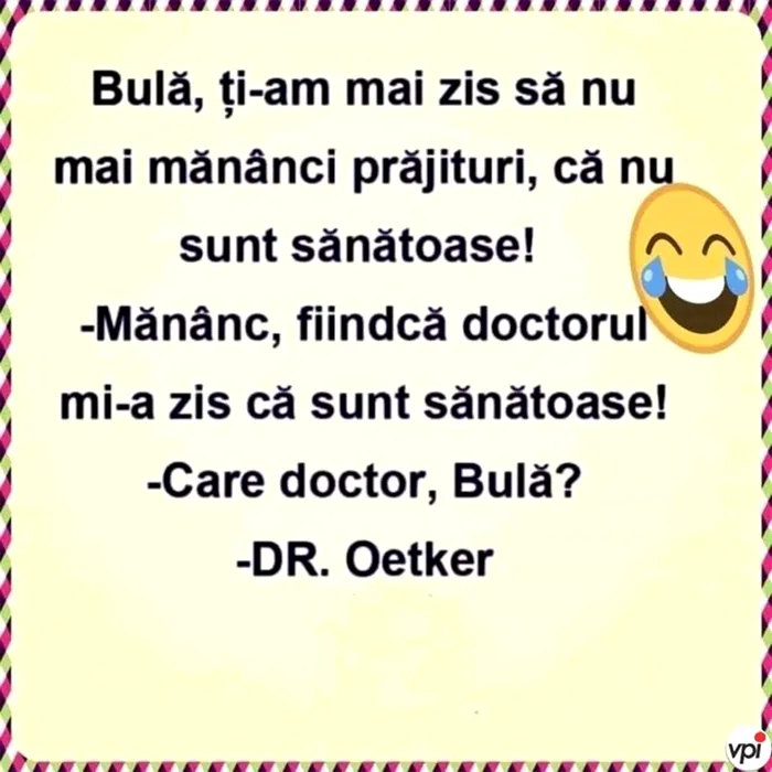 – Bulă ți-am zis să nu mai mănânci prăjituri, că nu sunt sănătoase!