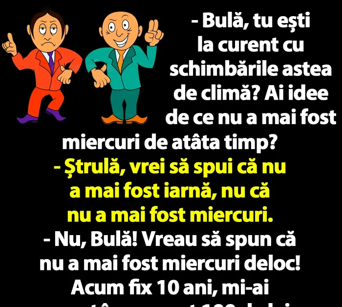– Nu, Bulă! Vreau să spun că nu a mai fost miercuri deloc! Acum fix 10 ani, mi-ai cerut împrumut 100 de lei până miercuri. Și nu a mai fost miercuri de atunci.