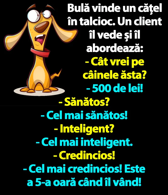 Bulă vinde un cățel în talcioc. Un client îl vede și îl abordează: