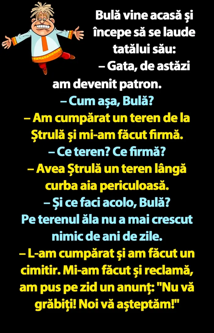 – L-am cumpărat și am făcut un cimitir. Mi-am făcut și reclamă, am pus pe zid un anunț: „Nu vă grăbiți! Noi vă așteptăm!”