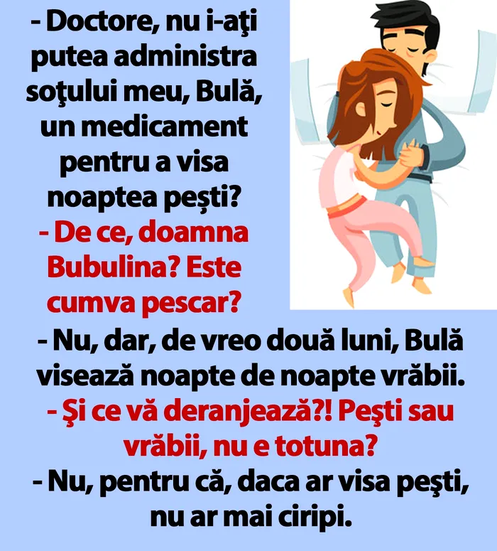 Doctore, nu i-aţi putea administra soţului meu, Bulă, un medicament pentru a visa noaptea pești?