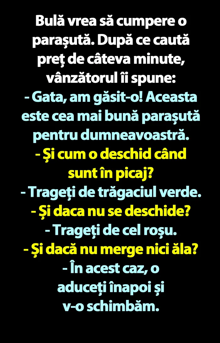 Bancul de azi este despre Bulă, care vrea să cumpere o parașută. După ce caută preț de câteva minute, vânzătorul îi spune…