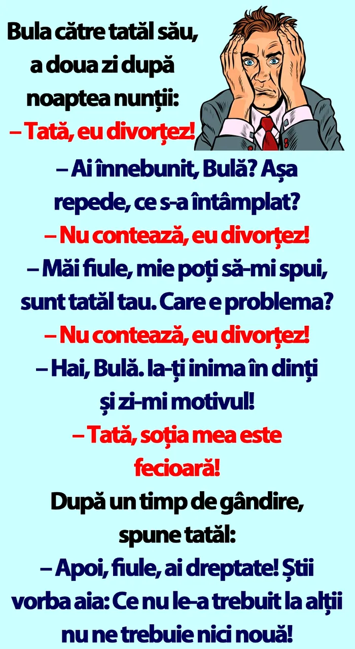 – Apoi, fiule, ai dreptate! Știi vorba aia: Ce nu le-a trebuit la alții nu ne trebuie nici nouă!