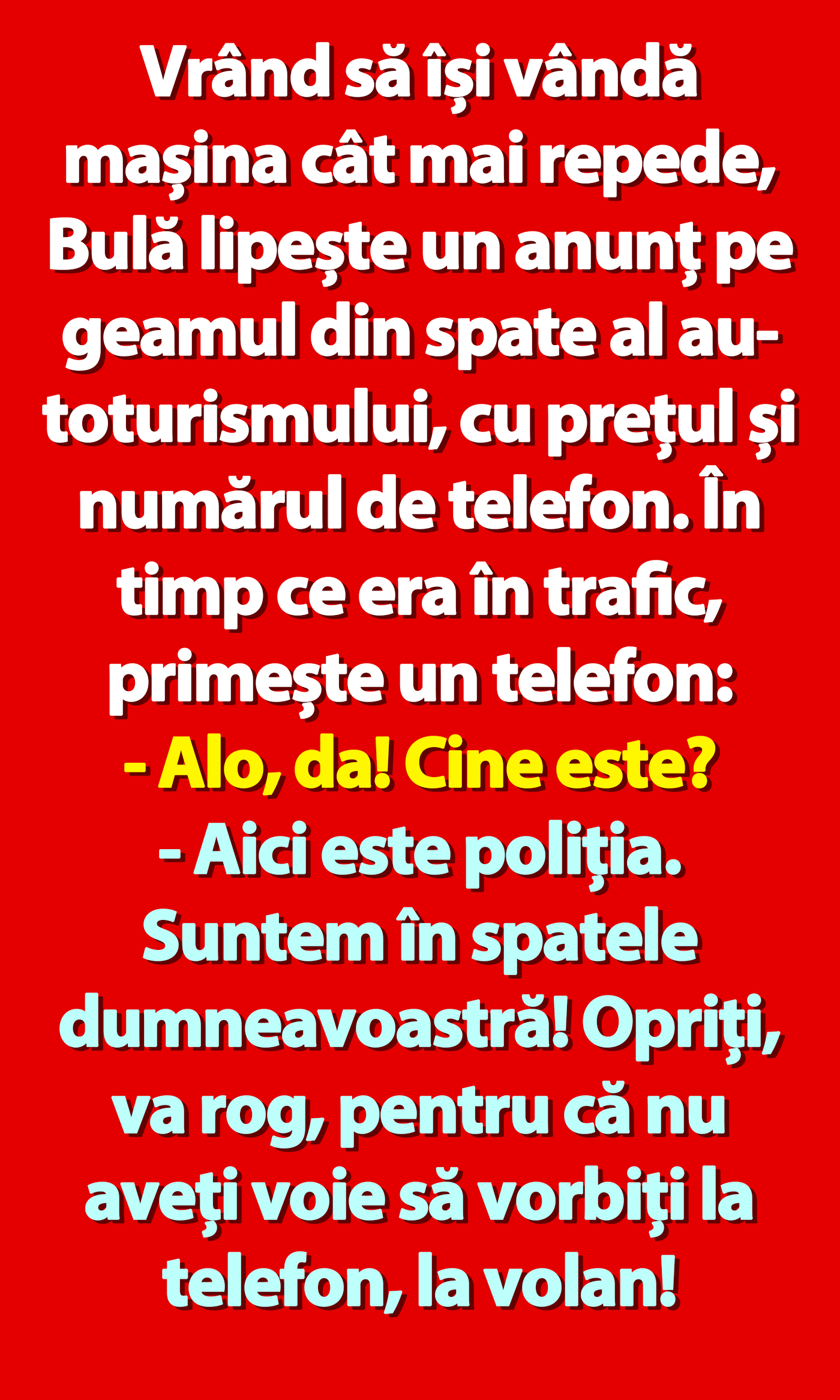Dacă e vineri, atunci vă delectăm cu un nou banc marca Bulă. De data aceasta, Bulă vrea să își vândă mașina, însă ce se întâmplă mai departe?