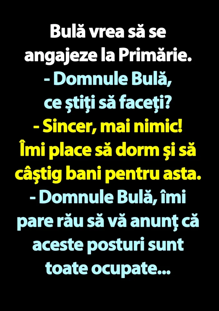 – Domnule Bulă, îmi pare rău să vă anunț că aceste posturi sunt toate ocupate…