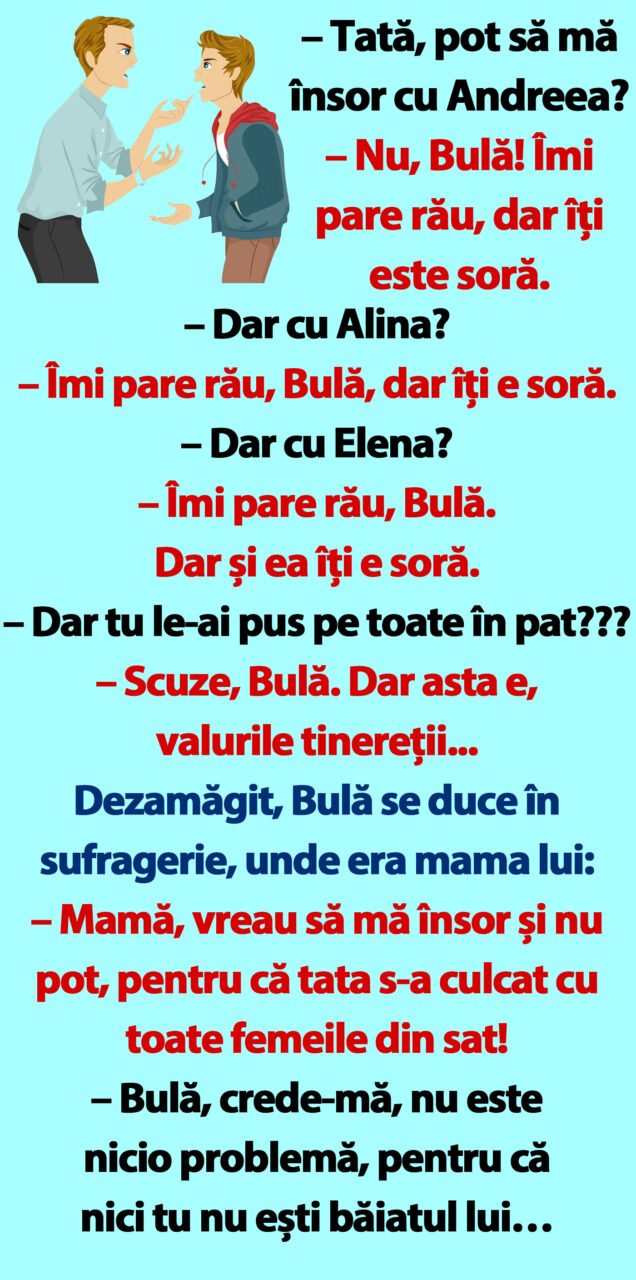 – Mamă, vreau să mă însor și nu pot, pentru că tata s-a culcat cu toate femeile din sat!