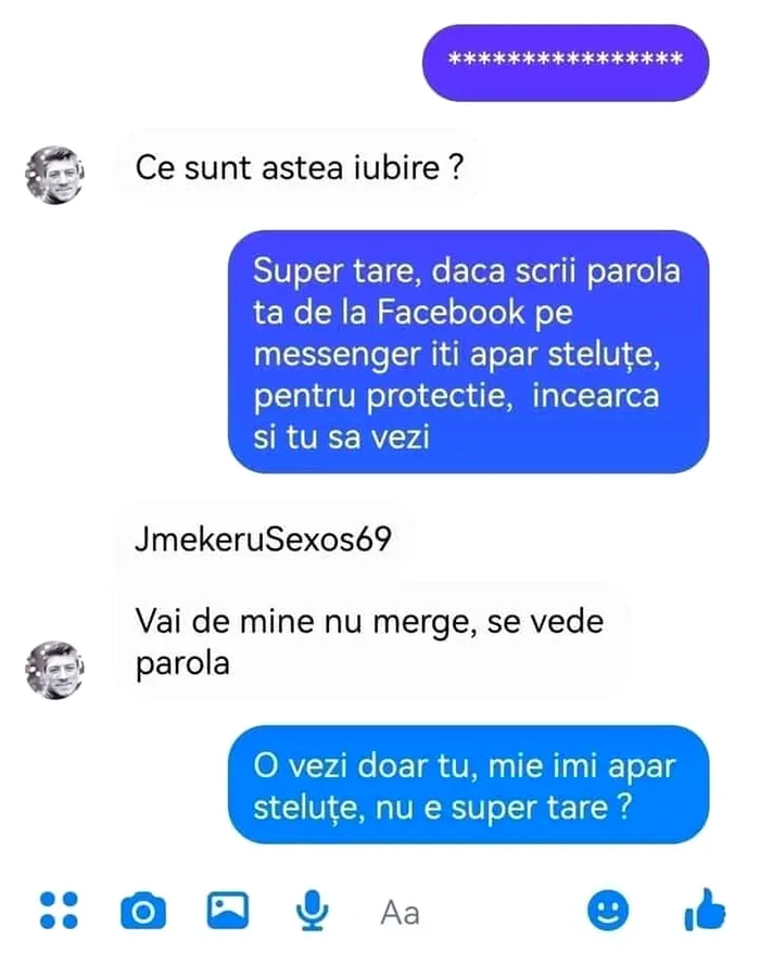 – Super tare, dacă scrii parola ta de la Facebook pe Messenger îți apar steluțe pentru protecție, încearcă și tu să vezi.