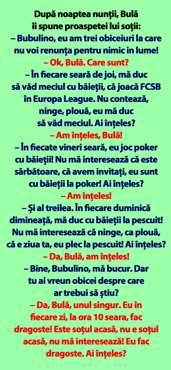 După noaptea nunții, Bulă îi spune proaspetei lui soții:
