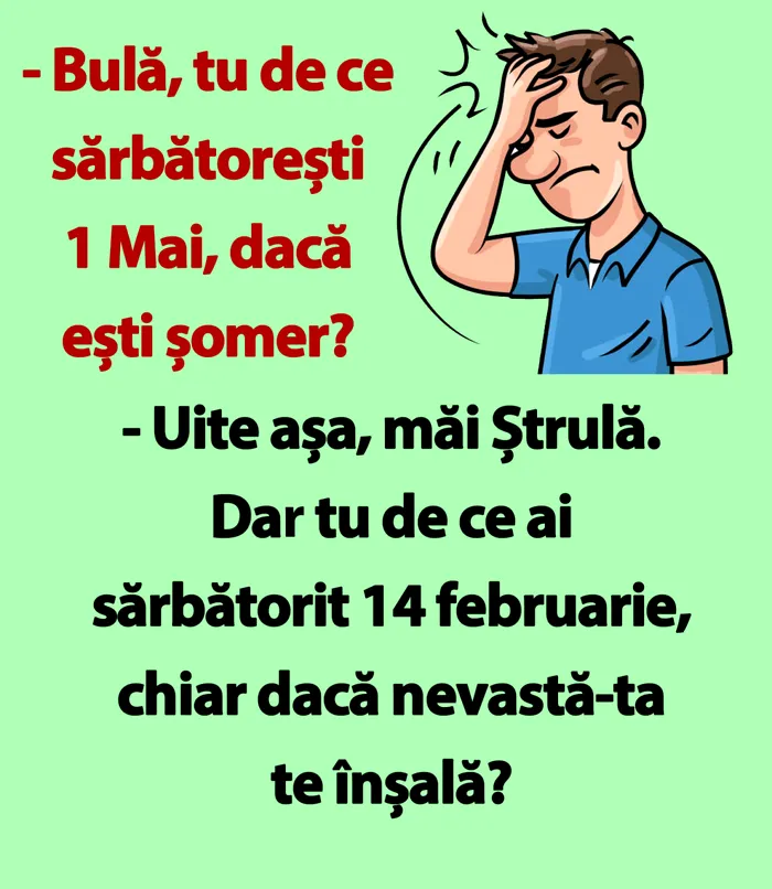– Uite așa, măi Ștrulă. Dar tu de ce ai sărbătorit 14 februarie, chiar dacă nevastă-ta te înșală?