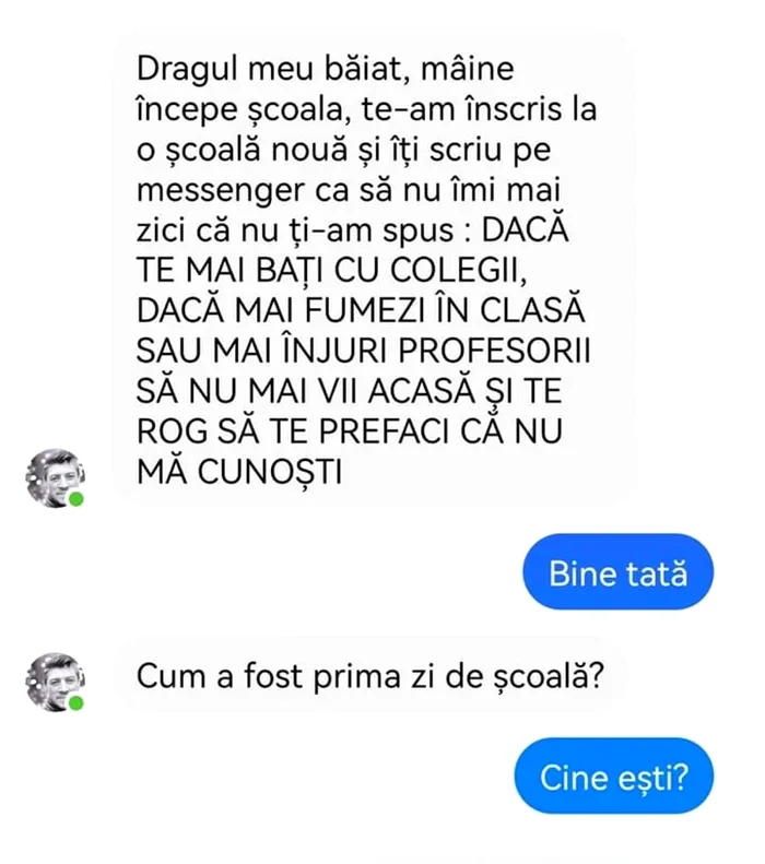 „-Dragul meu băiat, începe școala, te-am înscris la o școală nouă și îți scriu pe messenger ca să nu îmi zici că nu ți-am spus: Dacă te mai bați cu colegii tăi, dacă mai fumezi în clasă sau mai înjuri profesorii, să nu mai vii acasă și te rog să te prefaci că nu mă cunoști.
