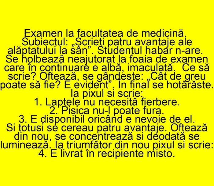 Continuă ziua cu zâmbetul pe buze. Banc: Examen la facultatea de medicină: „Scrieți 4 avantaje ale alăptatului la sân!”