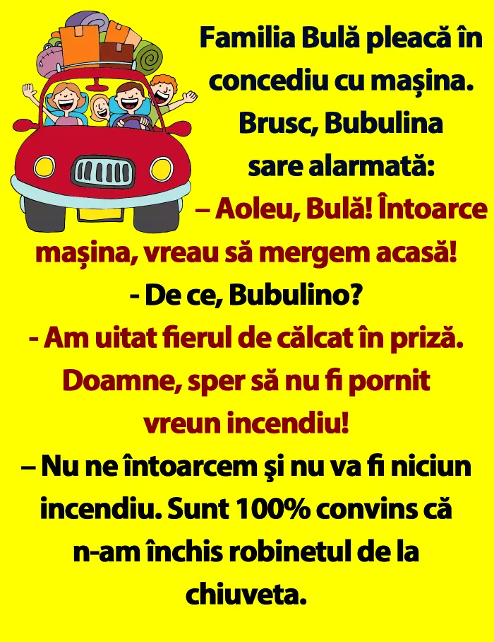 Bancul de la această oră este despre familia Bulă, care pleacă în concediu cu mașina, dar – brusc – Bubulina sare alarmată: