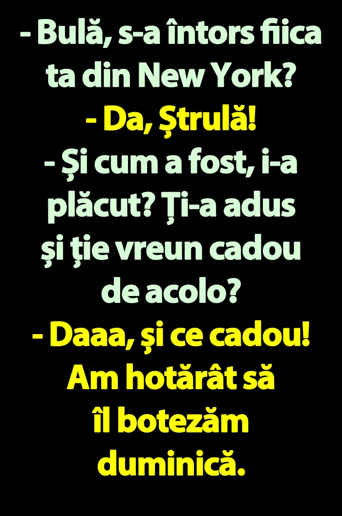 Bulă avea o fiică în SUA, care s-a întors recent în România. Dar, abia la sosire, a avut parte de o mare surpriză. Citește bancul și află despre ce este vorba.