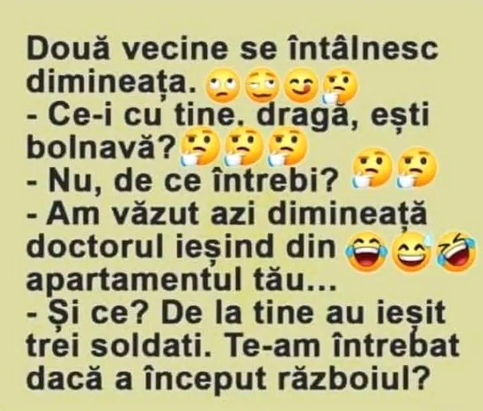 Chiar dacă azi este abia marți și tocmai ce ne-am întors la muncă după o minivacanță meritată, hai să continuăm ziua cu voie bună și râsete! GÂNDUL.RO vă propune un banc amuzant, cu două vecine care se întâlnesc dimineața.