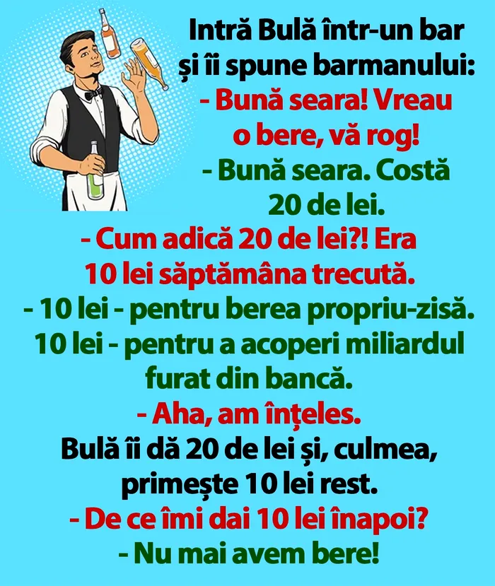Bulă îi dă 20 de lei și, culmea, primește 10 lei rest.