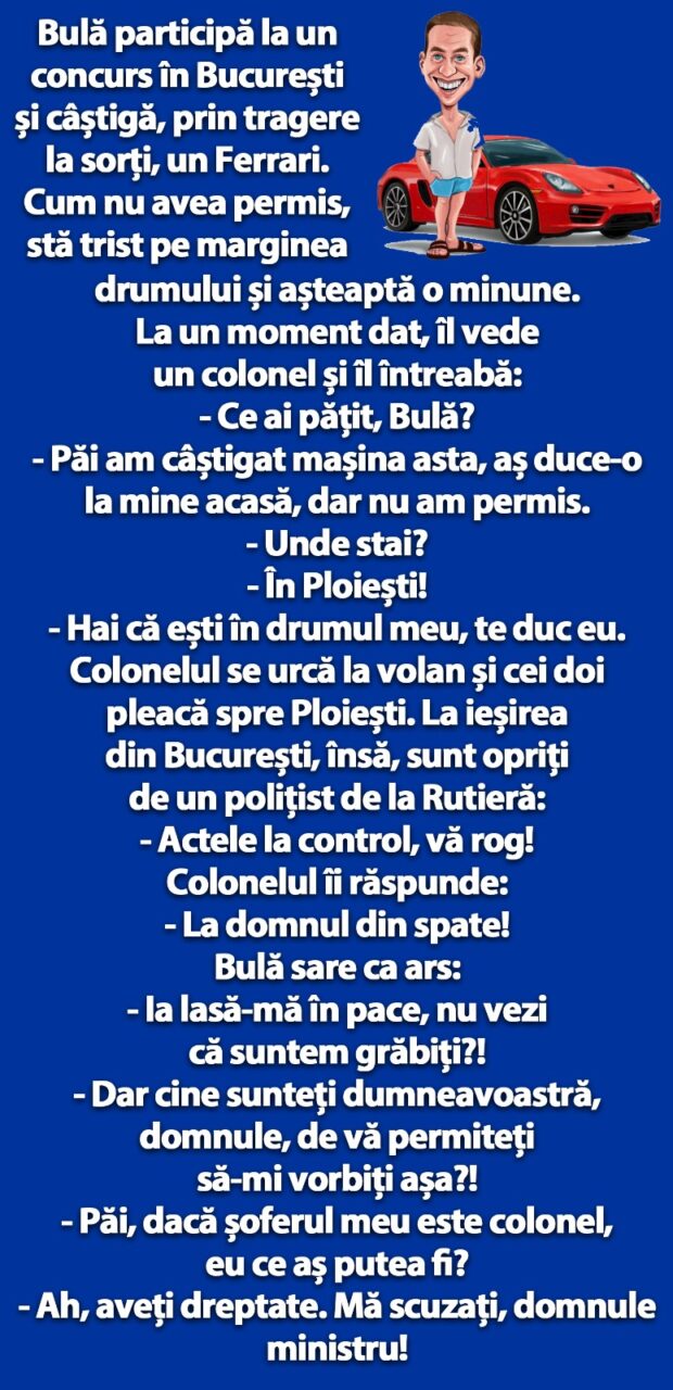 Bulă participă la un concurs în București și câștigă, prin tragere la sorți, un Ferrari. Cum nu avea permis, stă trist pe marginea drumului și așteaptă o minune. La un moment dat, îl vede un colonel și îl întreabă: