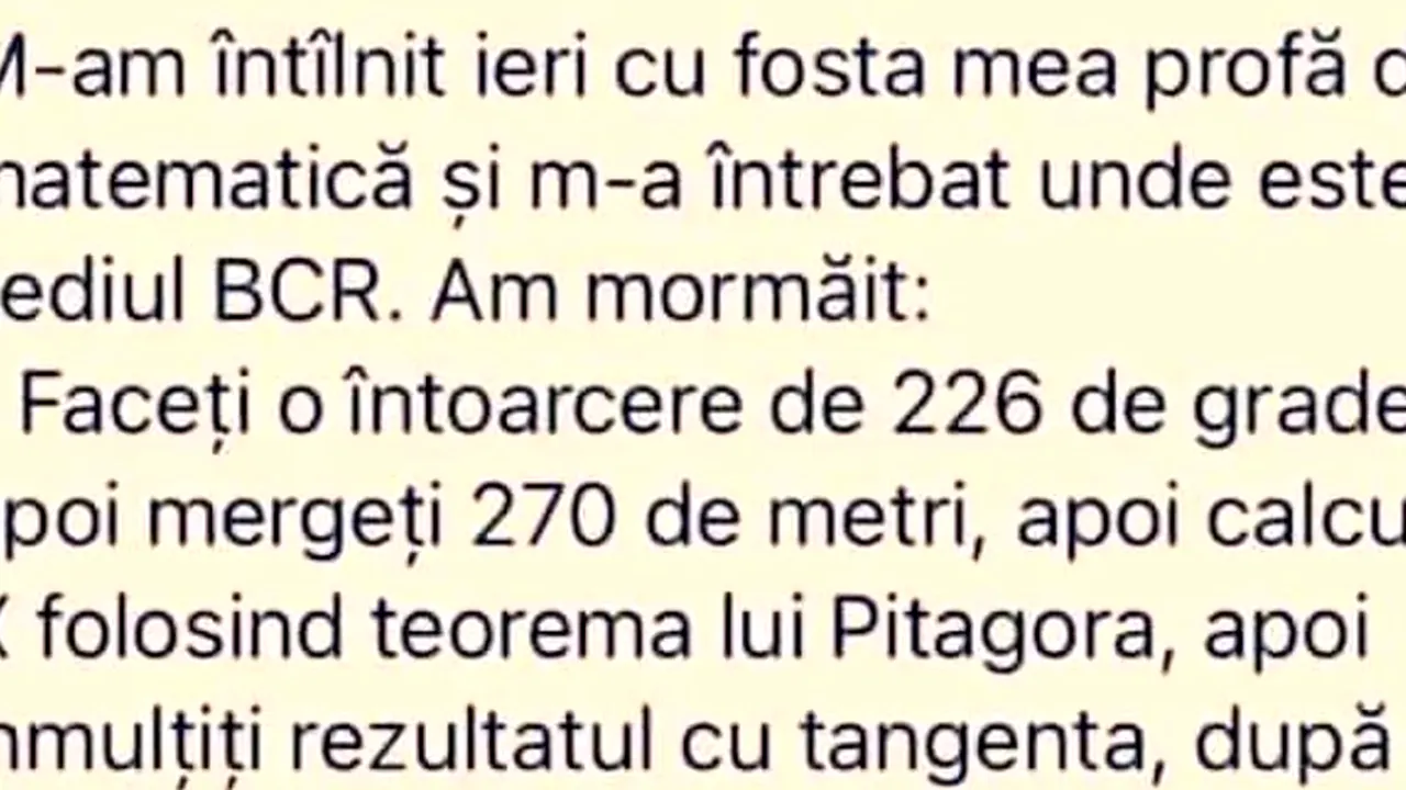 M-am întâlnit ieri cu fosta mea profă de matematică și m-a întrebat unde este sediu BCR. Am mormăit: