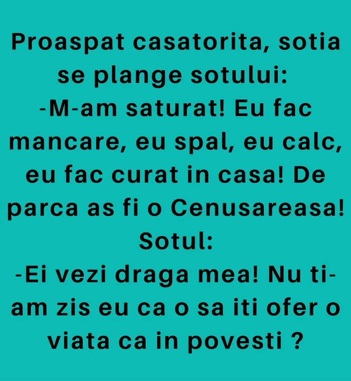– M-am săturat! Eu fac mâncare, eu spăl, eu calc, eu fac curat în casă. De parcă as fi o Cenușăreasă.