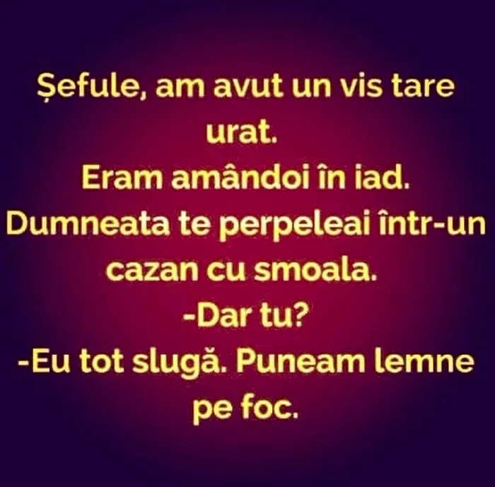 – Șefule, am avut un vis tare urât. Eram amândoi în iad. Dumneata te perpeleai într-un cazan cu smoală.