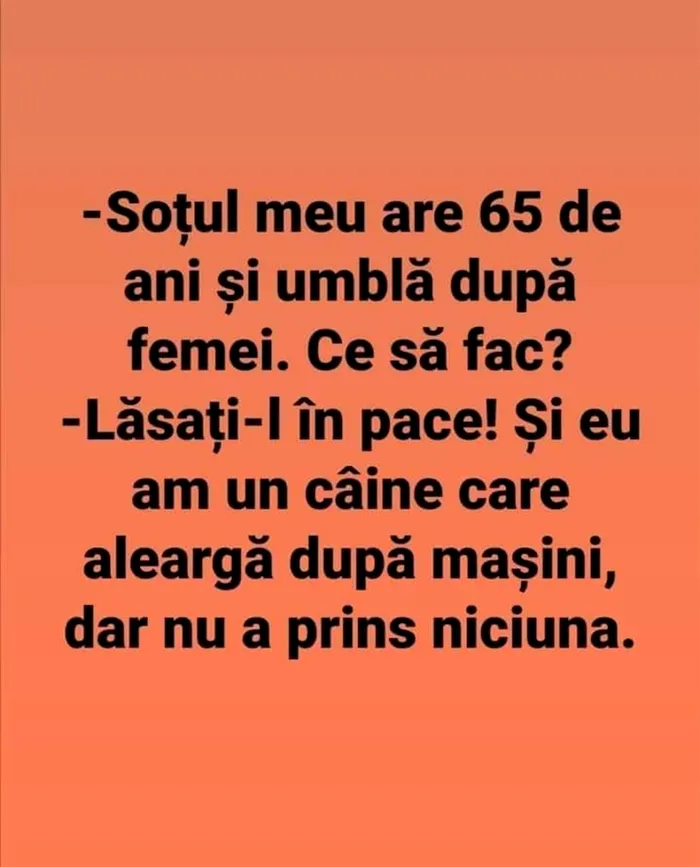 Bună dimineața, să fie o zi cu multe zâmbete și voie bună! GÂNDUL.RO vă vine în ajutor cu un banc bun: „Soțul meu are 65 de ani și umblă după femei”.