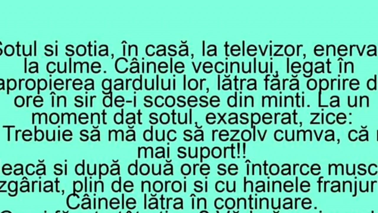 Soțul și soția, în casă, la televizor, enervați la culme. Câinele vecinului, legat în apropierea gardului lor, latră fără oprire de ore în șir de-i scosese din minți. La un moment dat soțul exasperat zice: