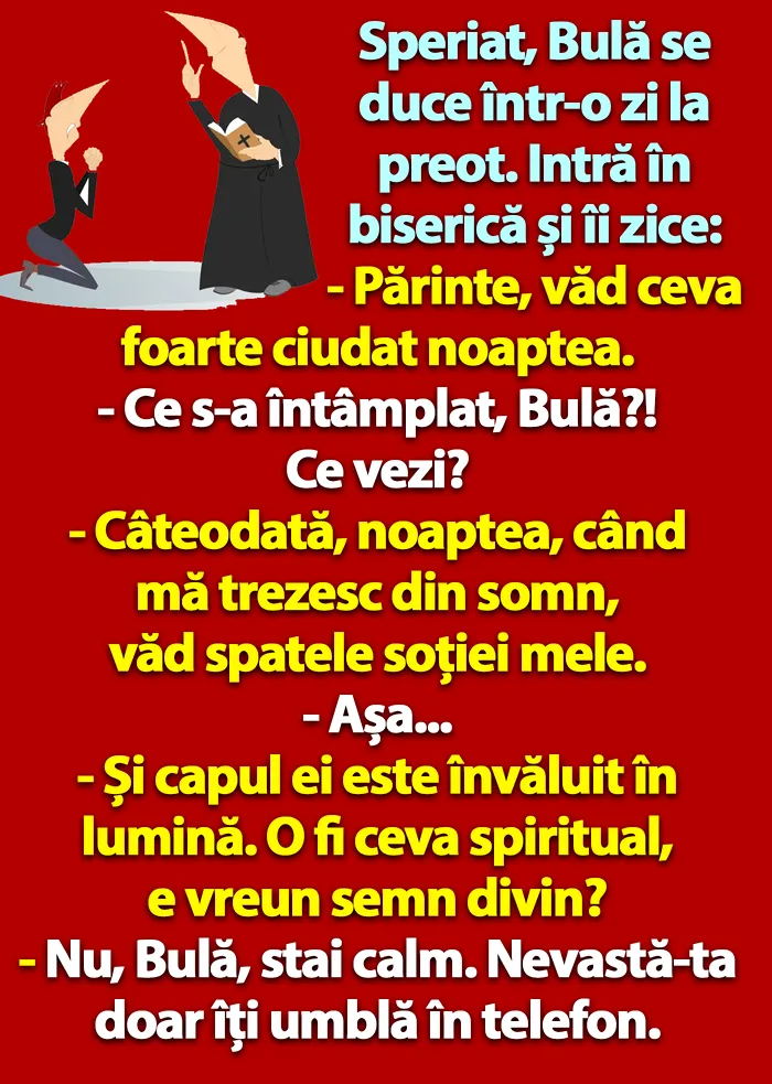 Speriat, Bulă se duce într-o zi la preot. Intră în biserică și îi zice: