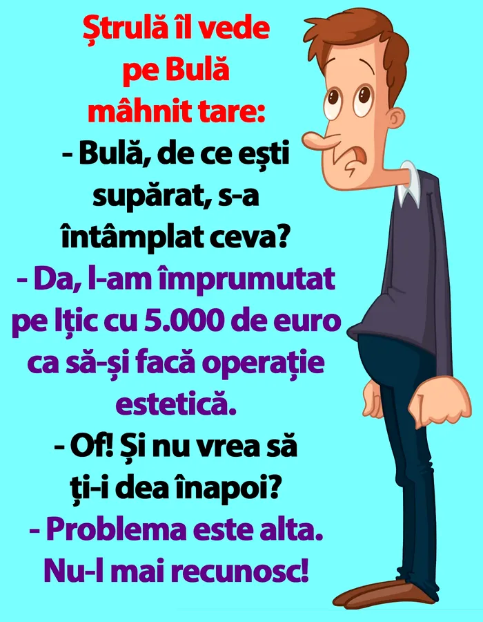 – Da, l-am împrumutat pe Ițic cu 5.000 de euro ca să-și facă operație estetică.