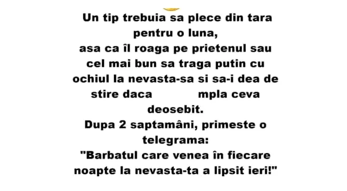 Un tip trebuia să plece din țară pentru o lună, așa că îl roagă pe prietenul său cel mai bun