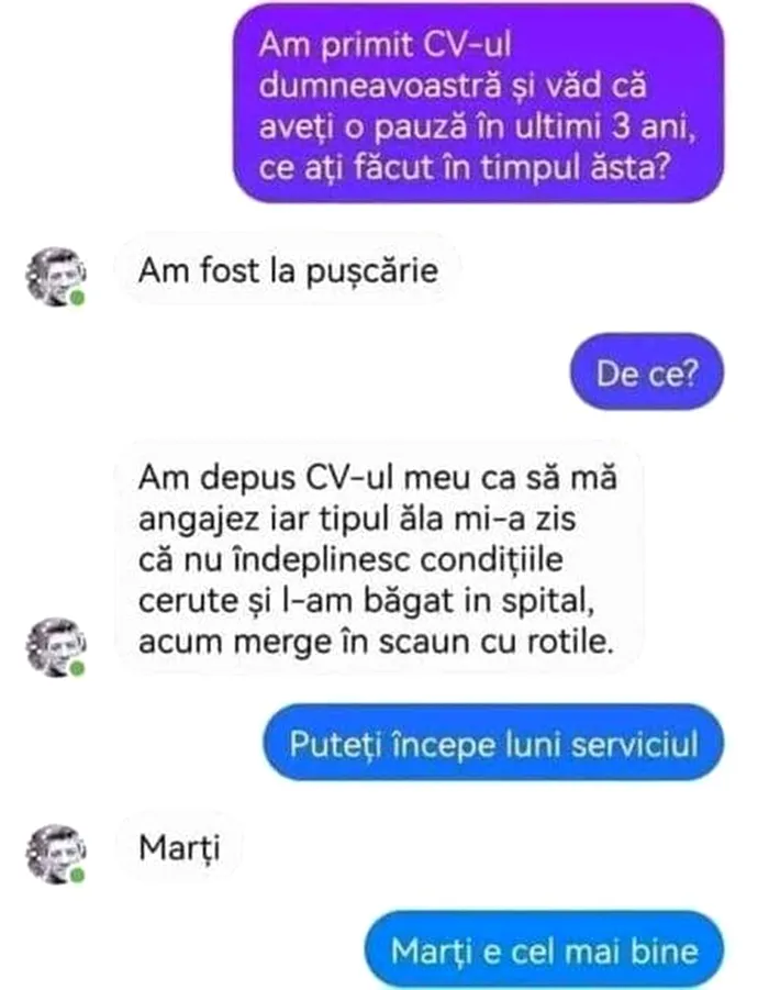 -Am depus CV-ul meu ca să mă angajez, iar timpul ăla mi-a zis că nu îndeplinesc condițiile cerute și l-am băgat în spital, acum merge în scaun cu rotile.
