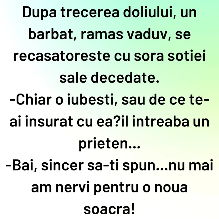 – Băi, sincer să-ți spun… nu mai am nervi pentru o nouă soacră.