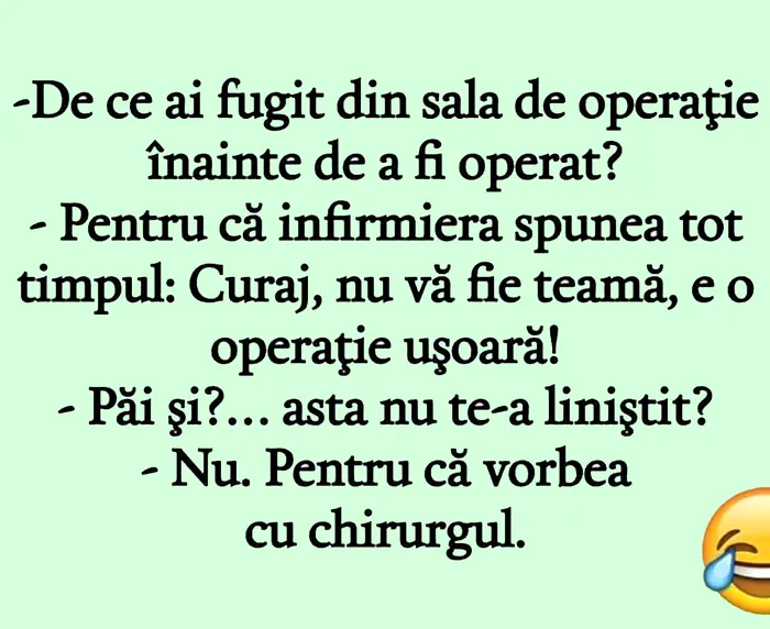 Ziua de duminică devine întotdeauna mai plăcută când o începem cu un moment amuzant. Redacția „Gândul” vă oferă un banc de împărtășit cu cei dragi: „De ce ai fugit din sala de operație?”.