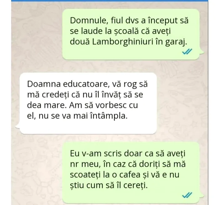 – Doamnă educatoare, vă rog să mă credeți că nu îl învăț să se dea mare. Am să vorbesc cu el, nu se va mai întâmpla.