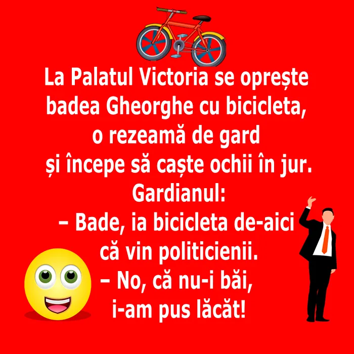 – Bade, ia bicicleta de-aici că vin miniștrii, primul-ministru.