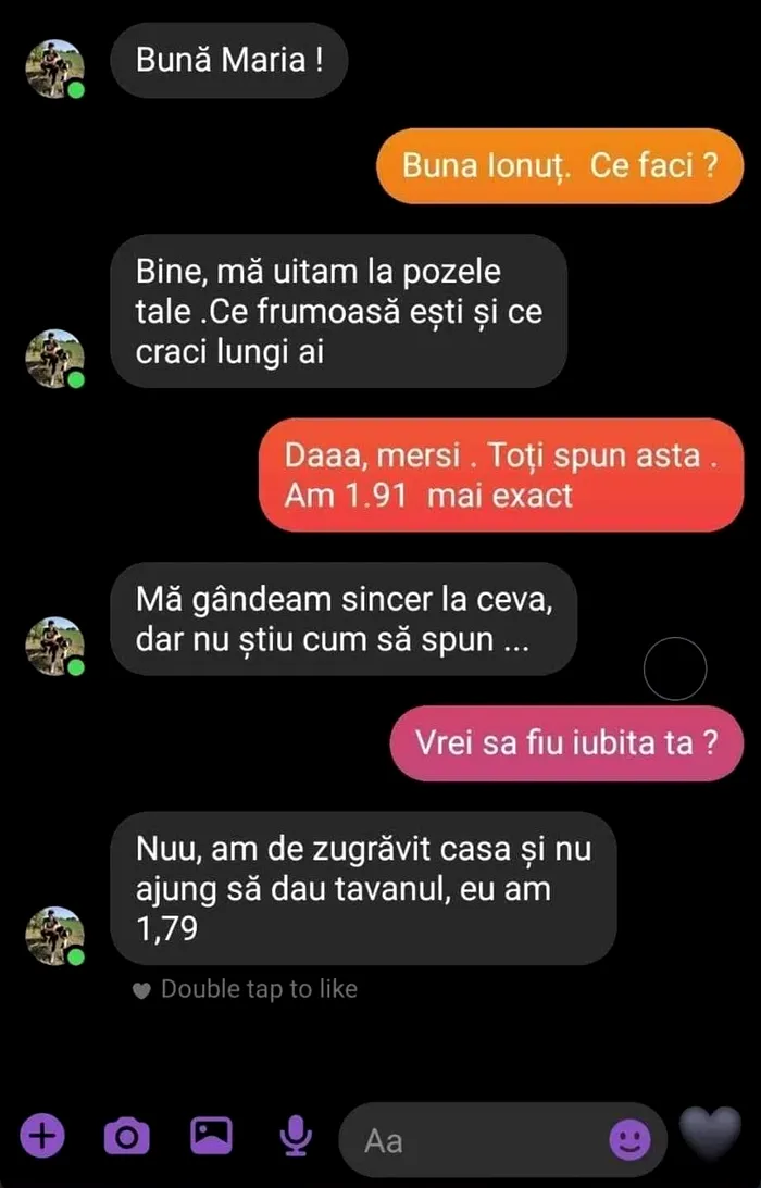 – Nuu, am de zugrăvit casa și nu ajung să dau tavanul, eu am 1,79