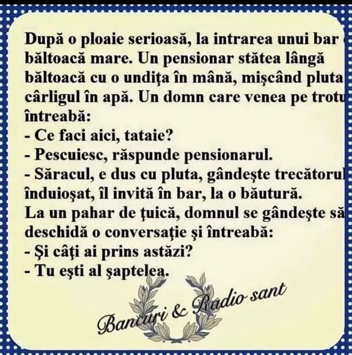 După o ploaie serioasă, la intrarea unui bar, băltoacă mare. Un pensionar stătea lângă băltoacă cu undița în mână, mișcând cârligul în apă. Un domn care venea pe trotuar întreabă: