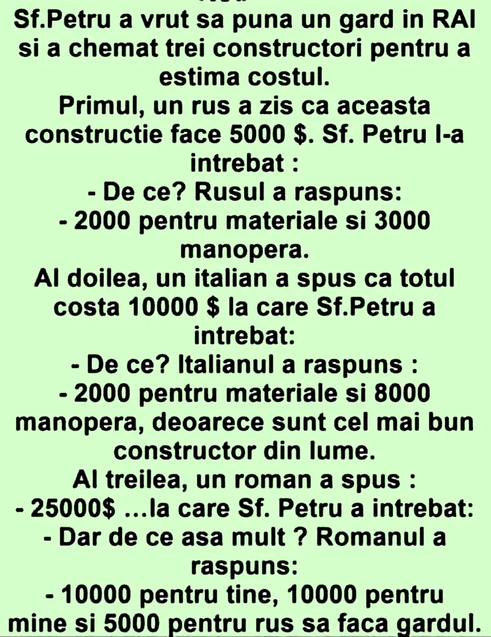 Sfântul Petru vrea să facă un gard în Rai și cheamă 3 constructori pentru a estima costul.