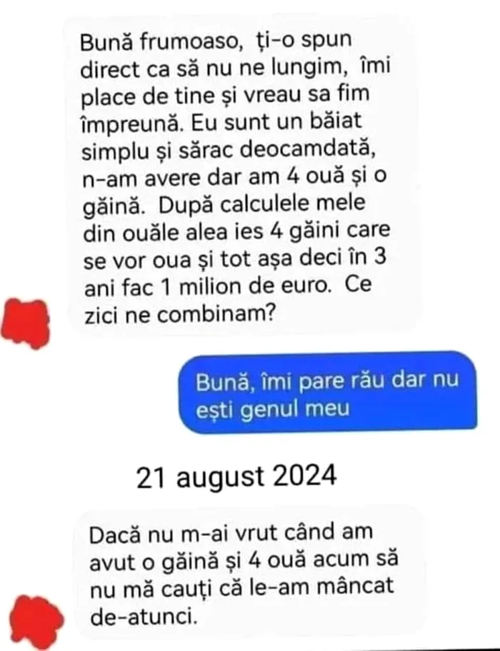–Dacă nu m-ai vrut când am avut o găină și 4 ouă, acum să nu mă cauți, că le-am mâncat de-atunci.