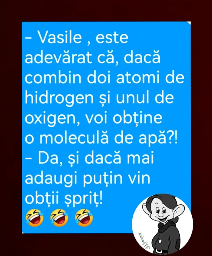 – Vasile, este adevărat că, dacă combin doi atomi de hidrogen și unul de oxigen, voi obține o moleculă de apă?